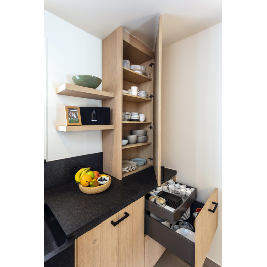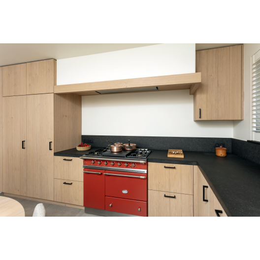 Voor deze realisatie in Dessel mochten we een landelijke keuken ontwerpen die tegelijk warm, praktisch en eigentijds aanvoelt. Het geheel werd uitgewerkt in natuurlijke houttinten, gecombineerd met een matzwart werkblad in graniet dat zowel duurzaam als stijlvol is. Het karaktervolle gasfornuis in bordeauxrood springt meteen in het oog en geeft de ruimte een authentieke toets.