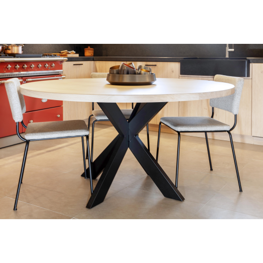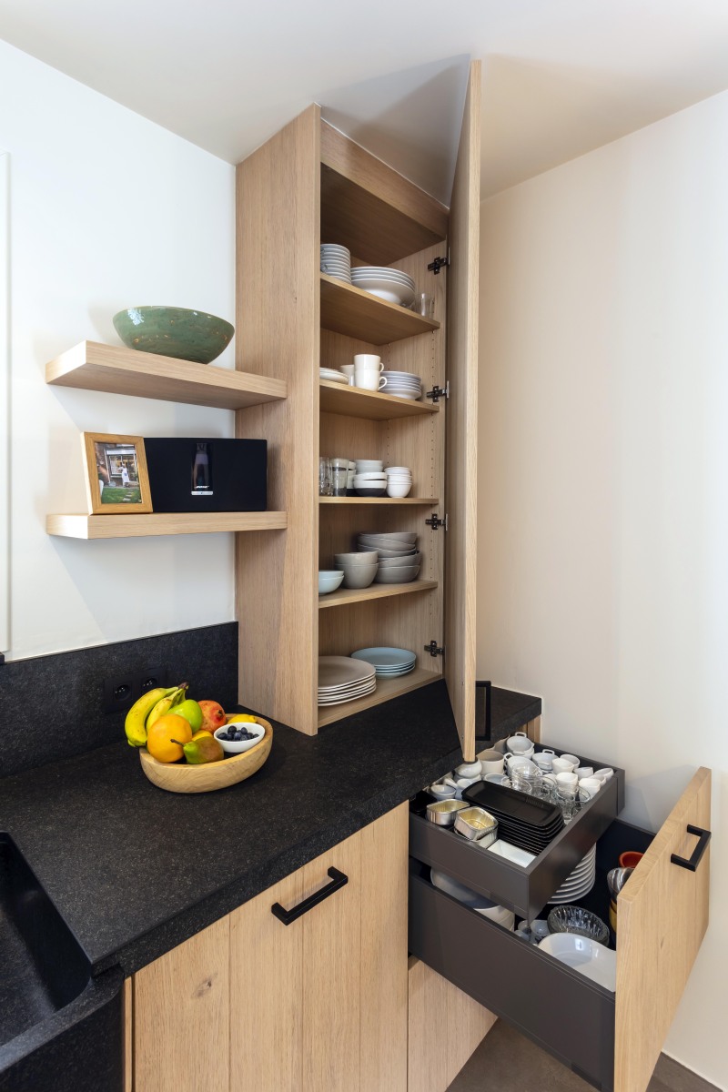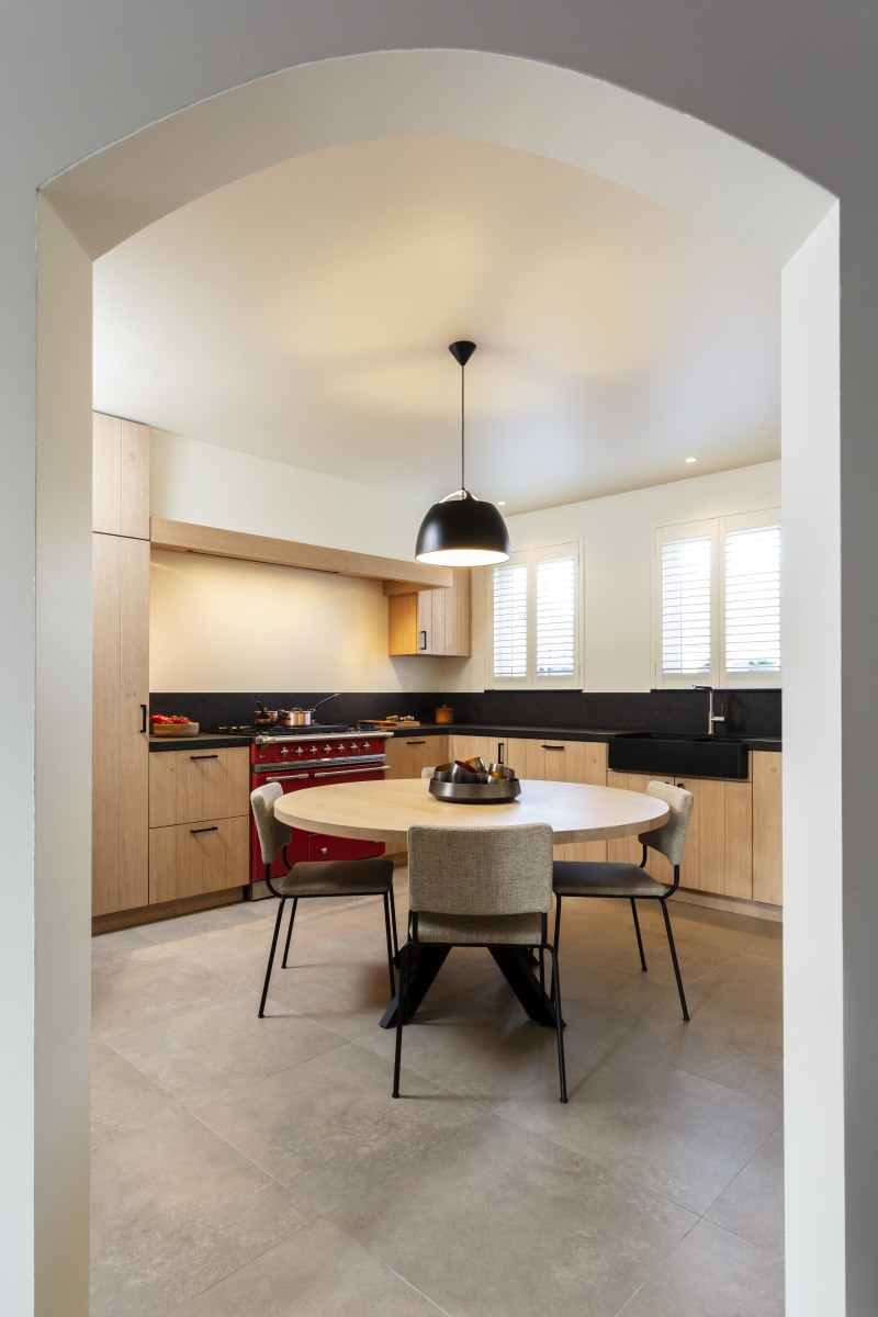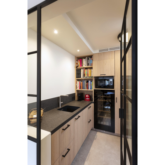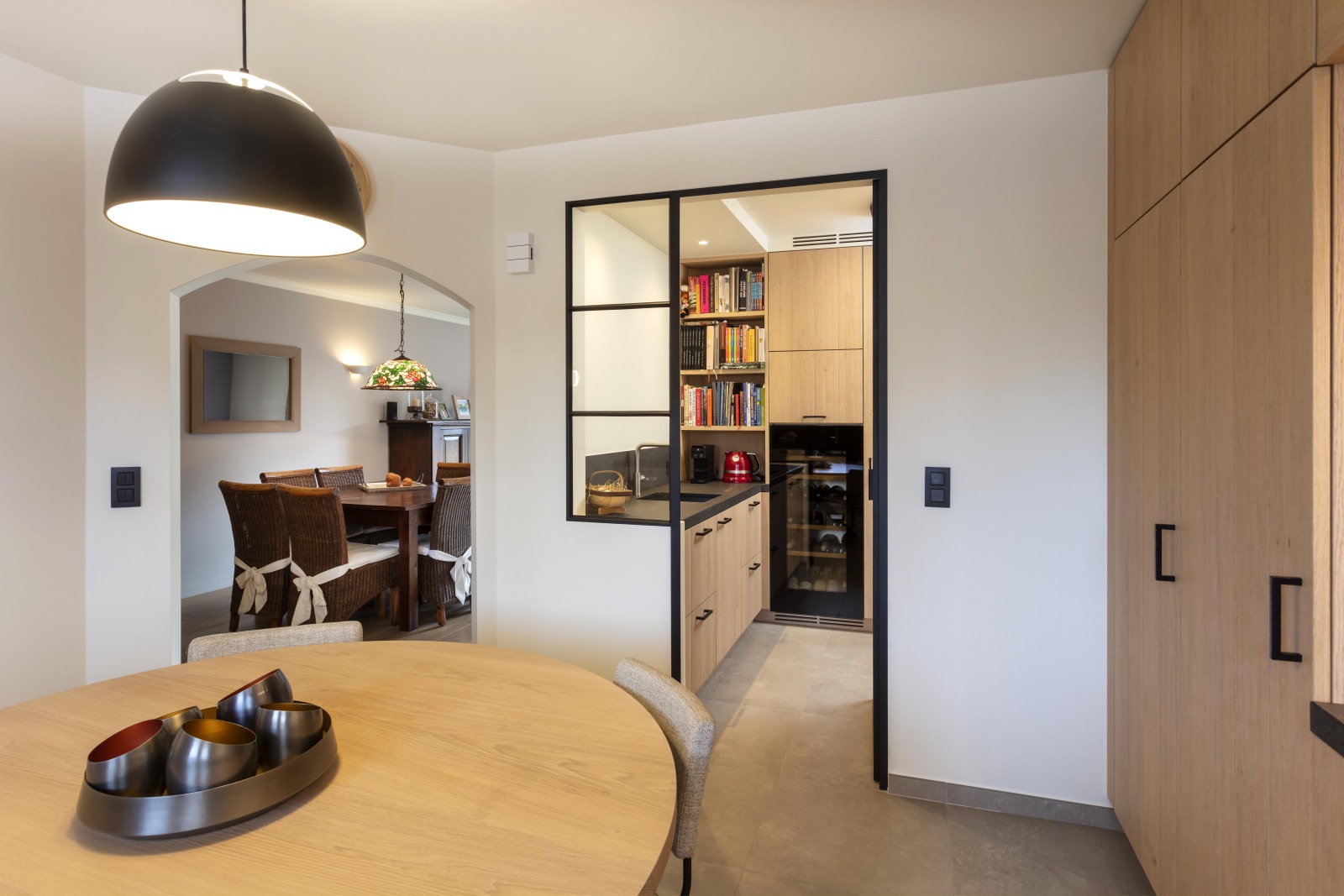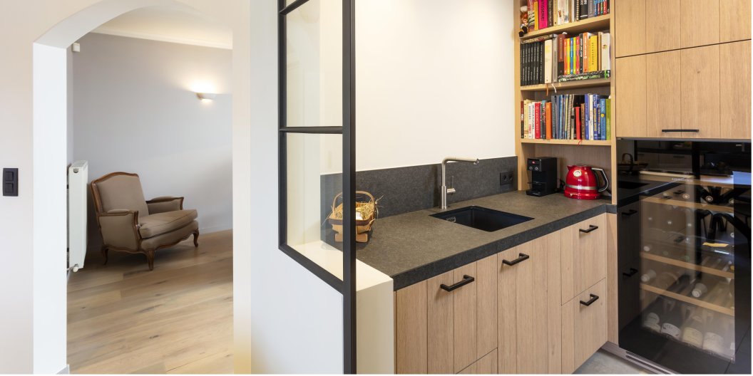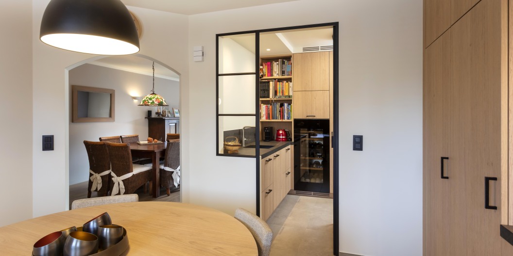 De vele kasten en lades zorgen voor een zee aan opbergruimte, zonder dat het geheel druk oogt. Er werd gekozen voor een geïntegreerde eethoek met een ronde tafel op een elegant zwart onderstel, perfect om gezellig aan te tafelen. In het verlengde van de keuken bevindt zich een op maat gemaakte bijkeuken, afgesloten met een stalen binnendeur. Deze ruimte herbergt extra voorzieningen zoals een tweede spoelbak, wijnklimaatkast en boekenkast, zonder afbreuk te doen aan de esthetiek.