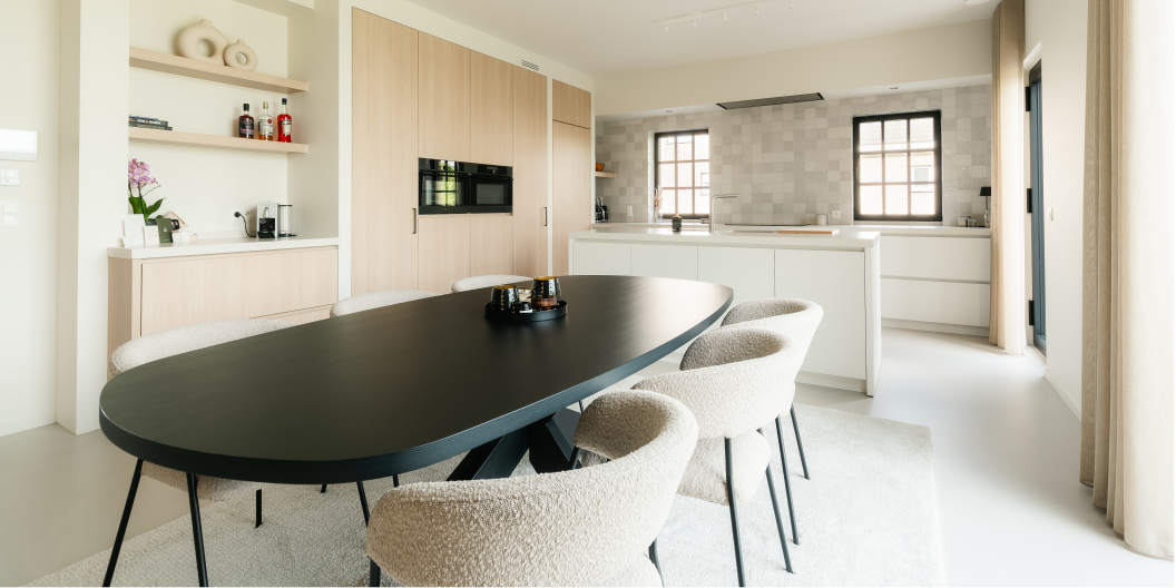 Deze moderne keuken in Oud-Turnhout ademt rust en eenvoud, met een uitgepuurd design dat tegelijk warm en uitnodigend aanvoelt. De combinatie van witte fronten en licht eiken maatkasten zorgt voor een natuurlijke balans tussen strak en sfeervol. Het keukeneiland biedt niet alleen extra werkruimte maar vormt ook het centrale ontmoetingspunt in de open leefruimte.