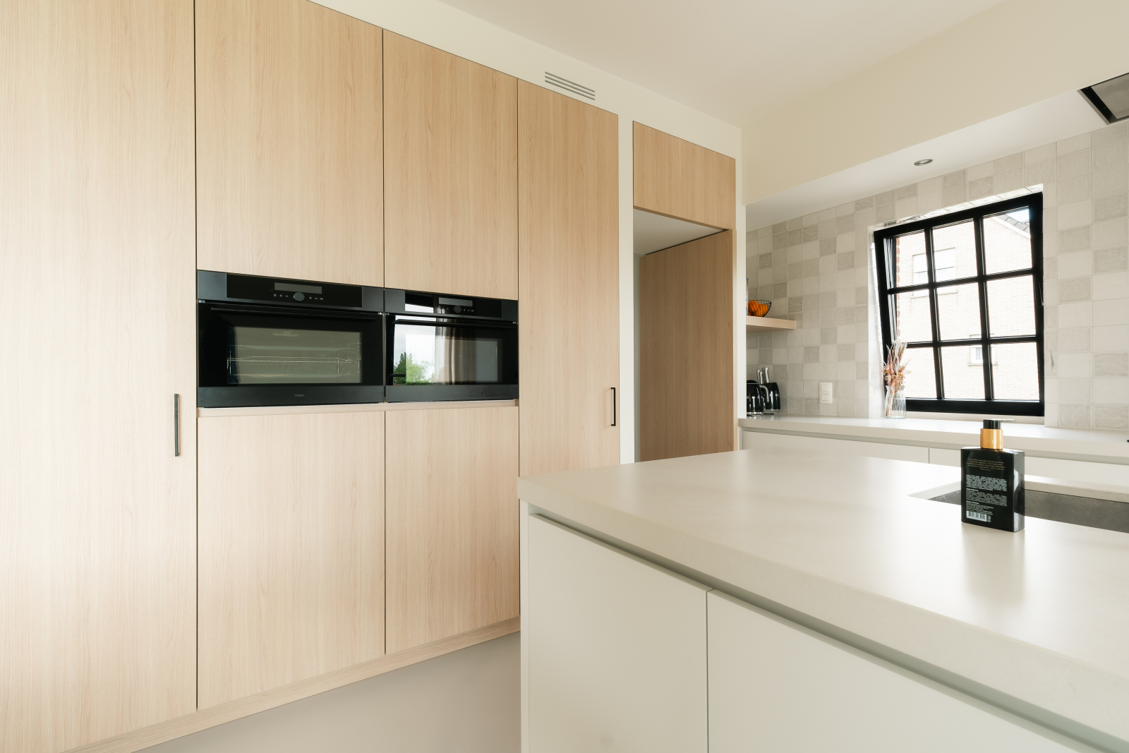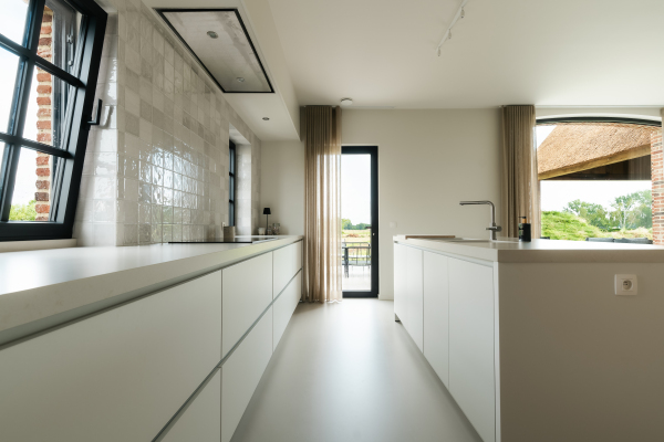 De wandtegels zorgen voor een subtiele textuur en karakter. De grote ramen brengen het buitengevoel naar binnen en zorgen voor veel natuurlijk licht. De integratie van hoogwaardige inbouwtoestellen en doordachte indeling maken koken, bewaren en opbergen uiterst efficiënt.