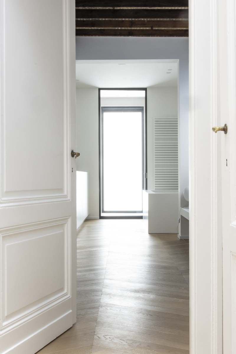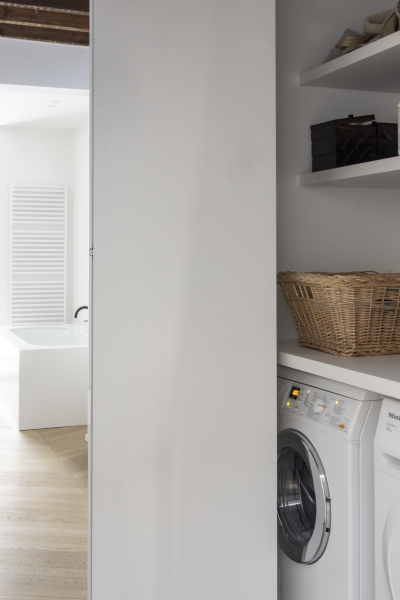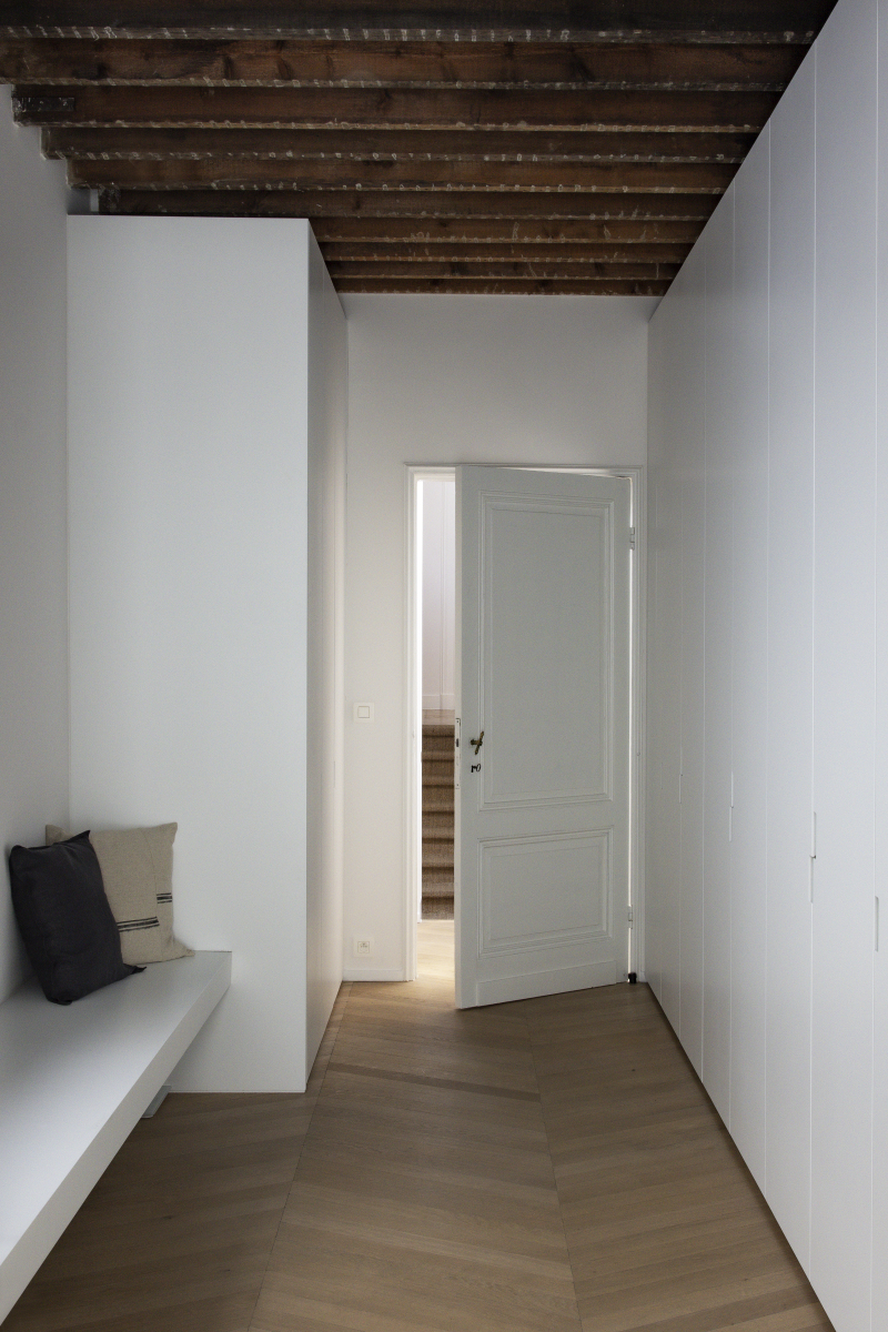 Verderop werd ook de badkamer volledig vernieuwd, met greeploze witte meubels, zwarte kranen en spiegelkasten over de volledige breedte. De masterbedroom en dressing genieten van dezelfde visuele rust, terwijl de gang en inkomhal gekenmerkt worden door ingemaakte kasten die het karakter van de woning bewaart.